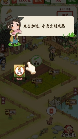 2.通过点击来完成播种、浇水、收割等基础农事,将收获的原材料送往磨坊、厨房等加工坊,制成价值更高的商品用于出售。