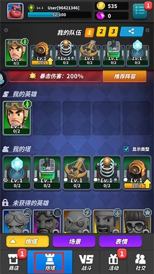 3、进入炮塔界面,玩家在这里可以搭配自己的阵容,了解自己的英雄,升级自己的塔以及管理场景和表情。