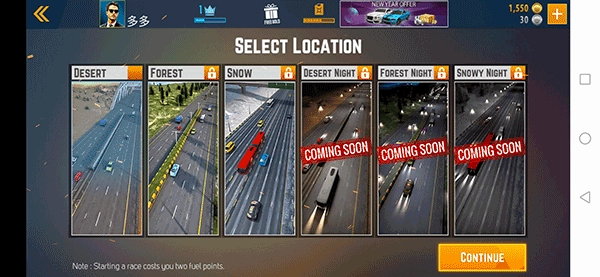 找到并点击“long drive(长途汽车模式)”,该模式下共有三张场景图,分别对应desert(沙漠)、forest(森林)和snow(雪地)。每张图包含白天和黑夜两种状态(其中黑夜模式暂未开放),你可以选择点击任意未上锁的图开始游玩。需要注意的是,上锁的图需通过购买、在游戏内挣钱解锁,或直接氪金获取;操作时,cancel为取消,confirm为确认,purchase为购买。