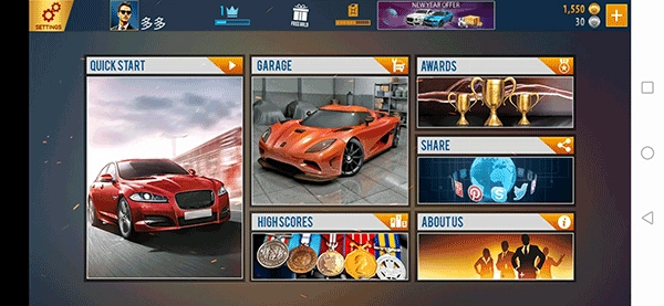 首先打开应用,主界面从左到右依次排列着quick start(快速比赛)、garage(车库)、high scores(高分榜)、awards(奖杯)、share(分享)和about us(关于)几个功能选项。