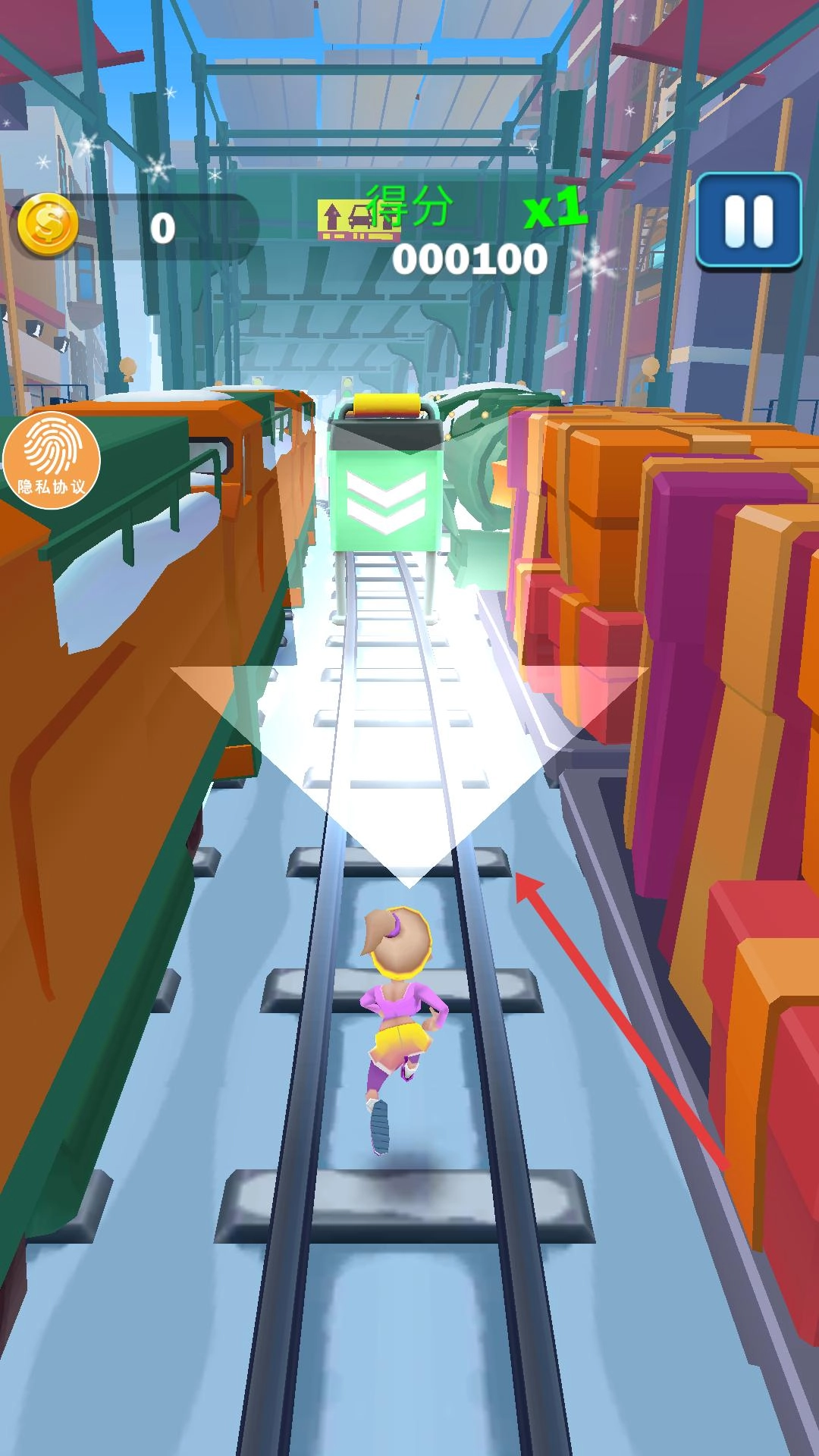 1、进入后,操控角色在轨道上奔跑,通过滑动屏幕来躲避障碍物,如火车、箱子等,持续前进。