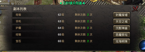 4、刷副本,经验副本也是一个重要的获取经验途径,副本十分简单,点进去挂机就好了,同时副本还能获得翅膀羽毛,魂珠碎片等重要材料,有条件的玩家尽量领双倍奖励。