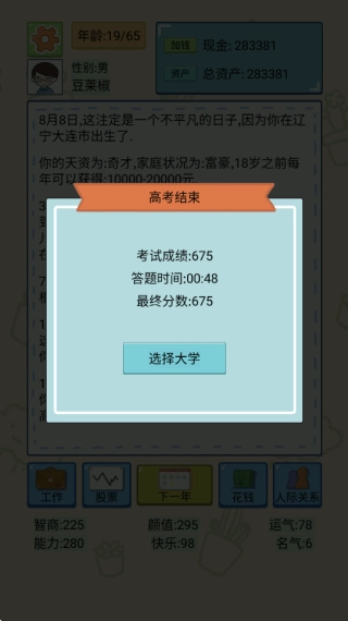 4.随后玩家需要通过答题的方式进行高考,如下图所示,随后你将可以根据自己的高考分数选择不同大学。