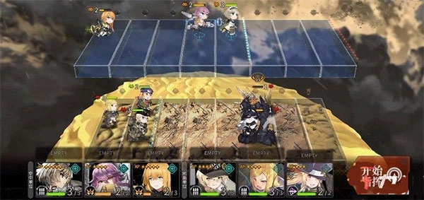 第三回合,派2架战斗机去攻击飞行单位,轰炸机启用空中堡垒战术,斯图卡往前推进,用专属技能攻击boss,坦克移动到第3格位置。上一回合要是boss没被打至瘫痪状态,奶妈斯图卡就继续施加debuff,其余成员保持原位。要是两次都没能成功挂上debuff,那就重新开始吧!