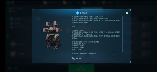 最后要重点说的是水蛭,它的技能机制相当棘手,冷却时间也比较短,具体效果可以参考图示。它最突出的优势在于开启技能后能获得90%的伤害减免,同时还会将35%的伤害反弹给被链接的对手。武器配置方面,难度适中——在中低端局,把四个中加特林(也就是攻击距离500的那款)升到九级基本就够用了。不过它也有个明显的短板,就是自身血量偏低(更适合中高端局)。另外最近即将推出蝎子,这个新角色同样很棘手,尤其克制这类依赖技能的机器人,具体细节我就不多透露了,毕竟它还有可能调整。以上就是我的推荐内容。