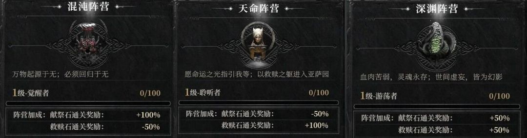 阵营的选择会与之后中的【献祭&救赎】玩法产生联系,每次关卡胜利后选择献祭或救赎将会有对应的加成,具体加成见下图;