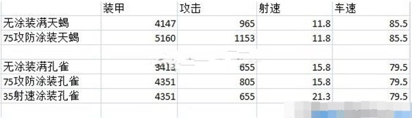 首先,拿满级75涂装孔雀分析,防御4351,攻击805,破防数值1610,射速是3.8秒一炮。