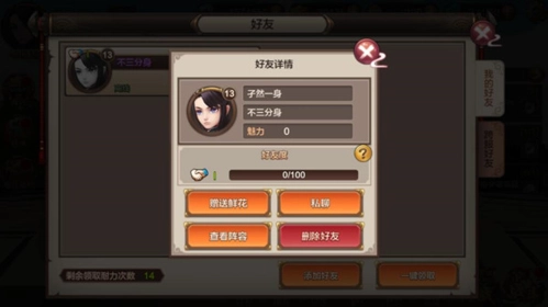 在好友界面里,玩家能够选择和好友进行私聊,赠送或者领取耐力,也可以点击好友头像,之后选择给好友赠送鲜花、发起私聊、查看好友的阵容,还能选择删除好友、查看与好友之间的好友度等操作。