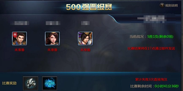 ①500强争夺赛:报名的3000支战队将进行相互匹配对战,每支战队拥有6次对战机会,累计失败3场即被淘汰。比赛结束后,胜利场次多的战队优先晋级;若胜利场次相同,则比赛积分高的战队优先晋级;若胜场与积分均相同,则战队三名队员总攻击力高的战队优先晋级。最终选拔500支队伍,晋级结果于当天17点通过邮件通知。
