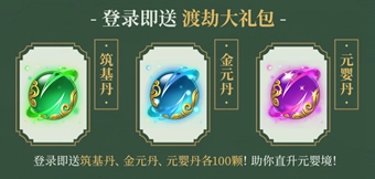 首发7天内,只要登录游戏,就能领取渡劫大礼包一份,里面包含从筑基、金丹到元婴阶段所需的大量渡劫丹药,帮助你以100%的几率轻松渡过雷劫,顺利登顶元婴境界!