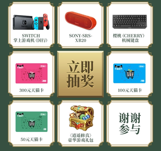 在首发7天内登录,即有机会抽取Switch、樱桃机械键盘、SONY-SRS-XB20音箱等实物好礼,数量有限,先到先得,送完即止。