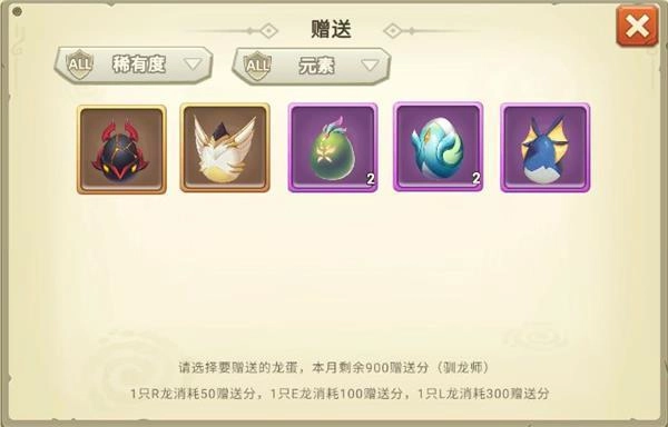 提升和好友的亲密度,能让亲密度等级得到提升。当亲密度等级达到2级及以上时,好友之间就可以互相赠送龙蛋,亲密度等级越高,每个月好友间能够赠送的龙蛋分值上限也会相应提高。玩家每个月最多能获取500分的龙蛋礼物。其中,R龙的分值为30分,E龙是100分,L龙则是300分。