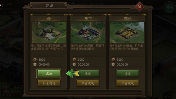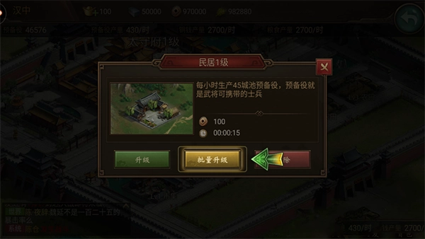 进入游戏后,首要任务是发展自己的城池。第一步就是建造民居,民居能够生产预备役士兵。这些预备役不仅是武将带兵作战的基础兵员,也是最基础的兵种,因此需要大量生产。
