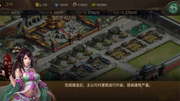 我们也得升级自己的太守府,毕竟太守府的等级是提升其他建筑等级的标准。升级太守府要消耗金币,还得花一定时间,等级越高所需时间越长,但可以用加速道具来缩短升级时间。
