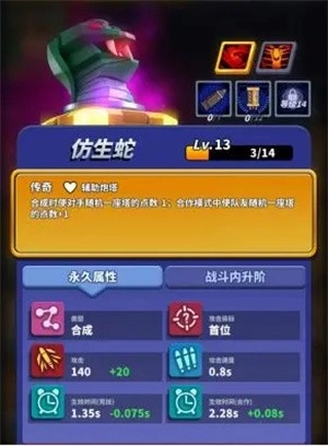 4、仿生蛇:在合作模式里是队友们不可或缺的关键存在,在竞技模式中则是对手们不能轻视的危险角色。当它的觉醒技能解锁后,还能在不同模式下一次性对对手(或队友)的防御塔点数产生±2的影响,是当之无愧的核心塔之一。