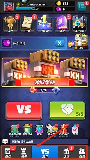 1、进入界面,分为商店、炮塔、战斗、活动和社交栏目。