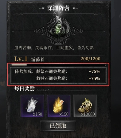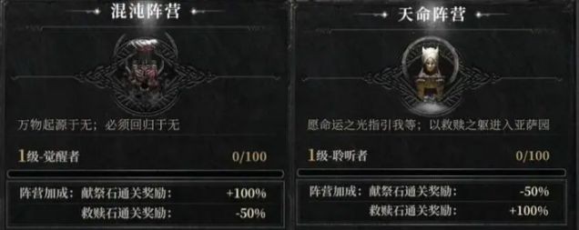 在主线击败最终Boss后,玩家需要在“献祭”与“救赎”之间做出选择——选择献祭可获得献祭石,选择救赎则能得到救赎石。若玩家所属阵营为混沌,选择献祭时献祭石的通关奖励将提升100%,但选择救赎时奖励会削减50%;反之,若玩家属于天命阵营,选择救赎可使救赎石的通关奖励增加100%,选择献祭则会导致奖励减少50%。