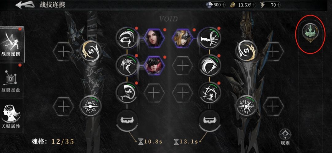 当魂核中包含【管理者欧德姆】、【霜龙·克希拉】、【星辰女神·弗丽嘉】这类具备特殊共鸣效果的魂核时,系统会优先依据它们的共鸣机制来搭配技能。以【星辰女神】为例,若其与海拉的十字切装备在相同位置,就能使【十字切】共鸣转化为【十字切·龙陨】。一旦共鸣效果生效,战技连携界面便会呈现出不同的特效。