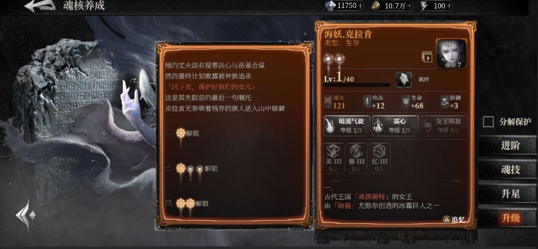 在魂核培养界面,继承者们能够对当前魂核展开培养操作。魂核具备星级、等级、养成属性、魂核技能等级、魂核故事等基础信息,这些内容都能通过培养魂核来实现提升或解锁。向右滑动界面,或者点击左上角的返回按钮,即可回到魂核背包页面。