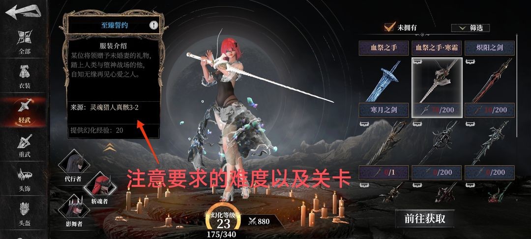 如图所示,时装分为套装、轻武、重武、头饰、头盔等等,每件时装都有自身获取要求,例如来源:灵魂猎人真骸3-2能获取至臻誓约-轻武器时装