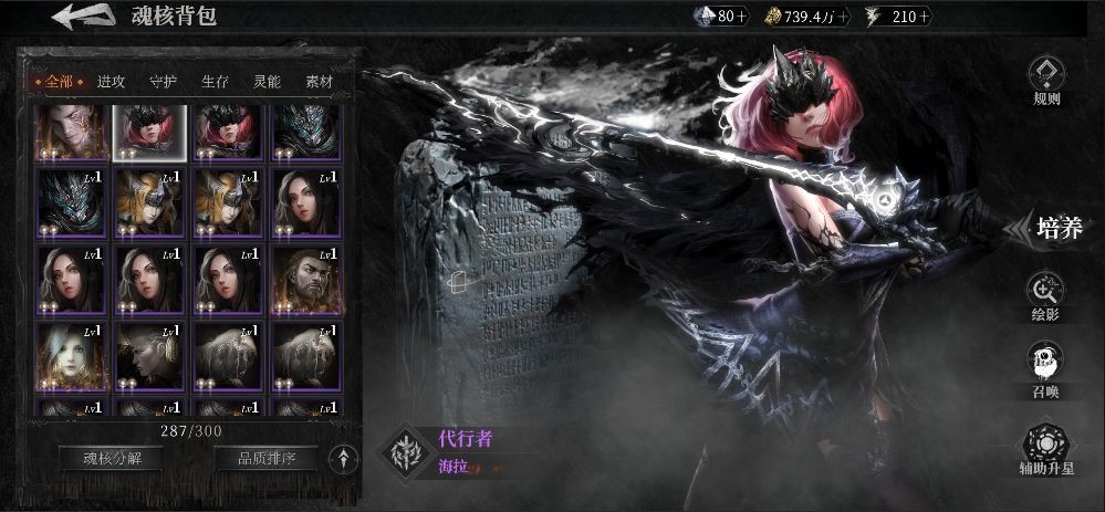 在魂核背包中,继承者们可以查看到自己的已有魂核,也可对其进行筛选、排序、分解、查看立绘等操作。同时,向左滑动可切换至魂核培养界面。