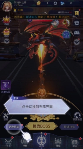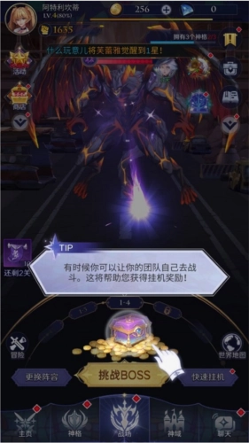 3、战斗模式是放置挂机类型,不过只有击败boss才能解锁下一个关卡。有时你也可以让团队自行战斗,这样能帮助你更快获取挂机奖励!