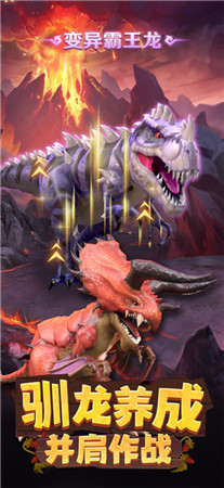 2、这里有数十种来自史前时代的蛮荒恶兽,你可以通过各种不同的方式收集并驯化它们,让这些恶兽加入你的防御军团,进而组建出一支强大的恐龙军团,一起守护自己的家园!