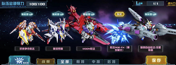 搭配思路:上述是加入典藏机体敢达AGE-FX(爆发模式)后的浮游炮系列机体阵容配置,两队的差异主要体现在队内大型机的选择上。强袭自由敢达/流星装备究竟该归入浮游炮系列机体队,还是SEED系列机体队呢?这需要依据实际情况来决定。要是把强袭自由敢达/流星装备安排在SEED系列队伍中,那么就可以让夜莺(浮游炮)上阵。