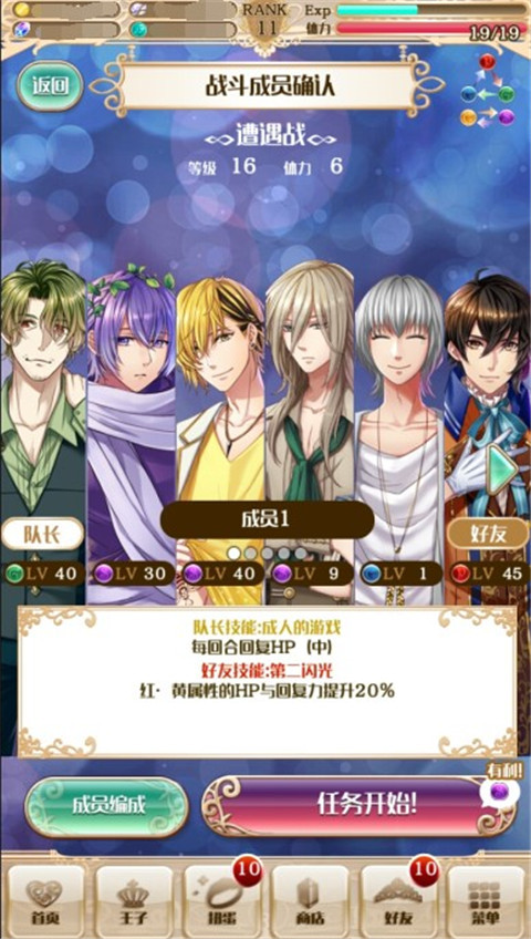 每回合的开始,王子的被动技能都会生效,并且还会在出战的王子中随机选取一个王子来鼓励玩家。并且当玩家只要点击宝石,该属性的王子就会有一些小动作并且还有一定的配音。