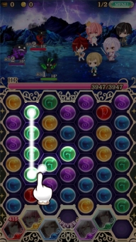所有角色都带有属性(颜色),消除对应颜色的球就能触发该颜色角色的攻击,消除的数量越多,攻击效果就越强。每次消除至少需要3个相同颜色的球才能被判定有效,每个行动回合有10秒的消除时间限制。当一次性消除6个相同颜色的球时,会生成一个爆弹,爆弹能对相邻位置的球造成爆炸消除效果。