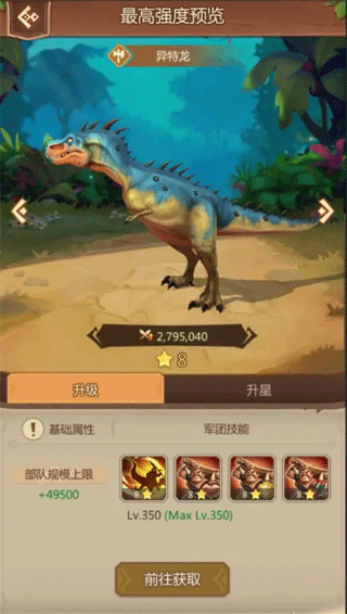 兵种展开培养,之后借助“军团技能+战术特技”的组合应用于军团战斗,让你毫无压力地尽情享受SLG的乐趣,还在犹豫什么,赶紧行动吧!侏罗纪军团玩法