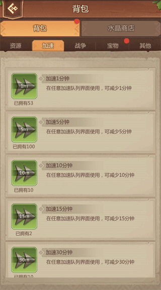 加速道具可分为分钟加速和百分比加速。前期因建筑/练兵的时间段,建议使用分钟加速道具。后期建筑所需时间长,可使用百分比加速。