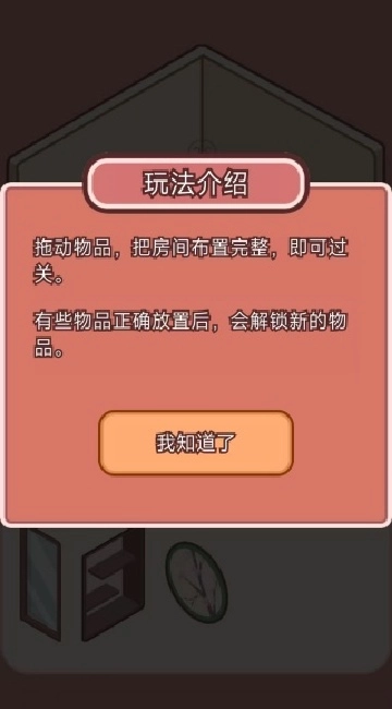 1、通过拖拽操作将物品摆放到房间合适位置,物品正确放置后,会解锁新的物品。