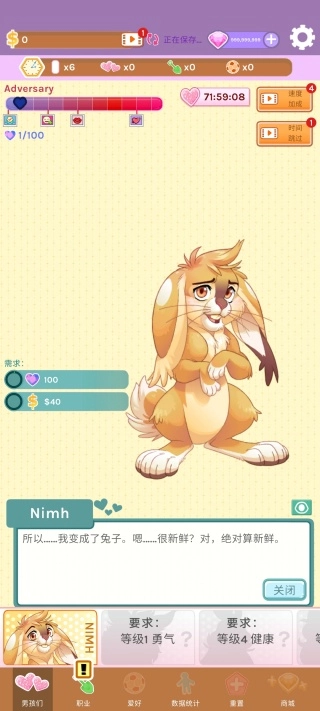 1、优先与Nimh互动提升亲密度,满足他对等级1勇气和等级4健康的需求,达成“损友”关系可解锁成就并获取时间块奖励。