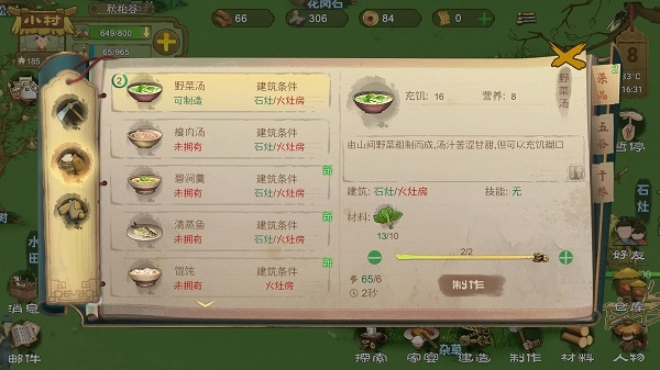 然后另一个食物采集点,这涉及到家宴的问题野菜:5颗野菜能做一碗野菜汤,肉在前期全靠豺狼来袭,肉汤是不能稳定得到的前期就是整天吃野菜过活。这些野菜汤放到家宴上影响了晚上打野的收入,人口的增加。
