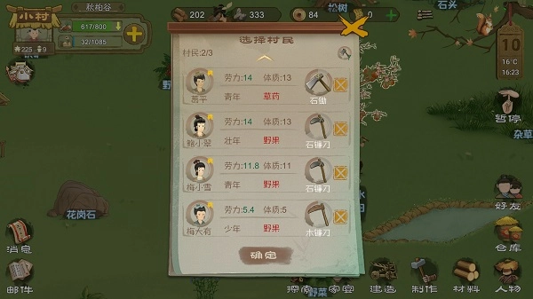 家有一老,如有一宝。老人拥有技能:【阅历】:可以把自己的技能传授给{年轻人}前期只有老爷爷拥有现成的割草技能。老奶奶虽然也有,但是是技能0的状态,不能传授。割草指(所有用镰刀的项目里,浆果跟草药不属于割草)都算割草技能生效范围;(再考虑到,老人会老死这点,得出最优排班组合)