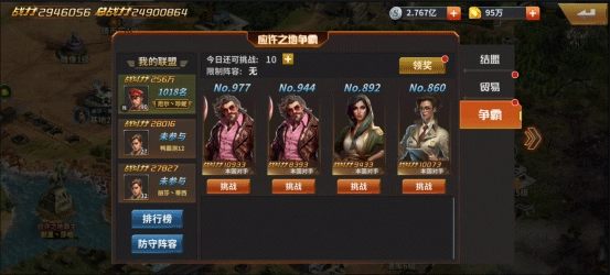 争霸玩法中,玩家能够配置防守阵容,向更高的排名发起挑战;而依据结盟成员里的最高排名,每日都能领取钻石等奖励。