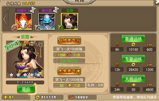 推图闯关获得的经验仅用于提升主角等级,仙将的等级需单独训练。仙将训练分为普通训练、专家训练、大师训练三类,每类都有相应说明。若想快速提升仙将等级,可使用仙功突飞或元宝突飞。