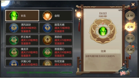 被动技能总计17个,完成相应等级的宝鉴副本、长生宝典以及转职任务,都能激活对应的被动技能。