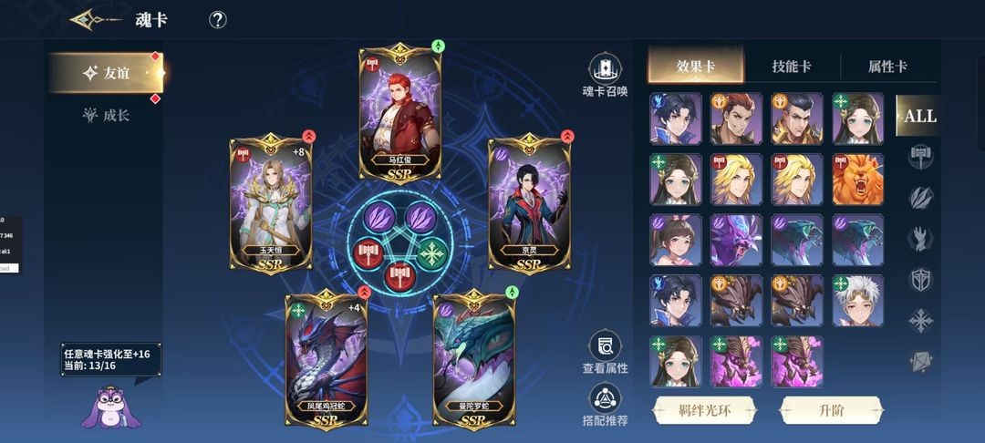 玩家在游戏前期可以自由强化魂卡,强化后支持回退操作,回退时会全额返还强化材料;即便强化的魂卡后续不再需要,等获取到所需魂卡后,也能先回退之前强化的魂卡,再用返还的材料去强化新的目标魂卡。下方图片会展示魂卡达到SSR品质后的属性详情,以及魂卡羁绊的触发条件,魂卡的属性构成依次为四维属性、基础属性和羁绊属性。
