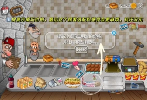 4、最后需要升级的是糖浆、自定义卷饼口味和薯条包装这三类,这三类的升级需要玩家手动操作,过程比较繁琐,特别是自定义卷饼口味,得留意顾客要求的卷饼口味,操作起来十分麻烦,建议最后攒够金币后一次性完成升级。