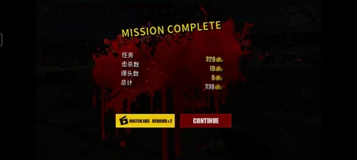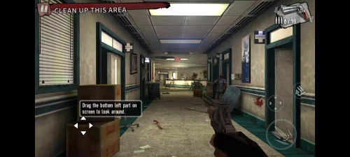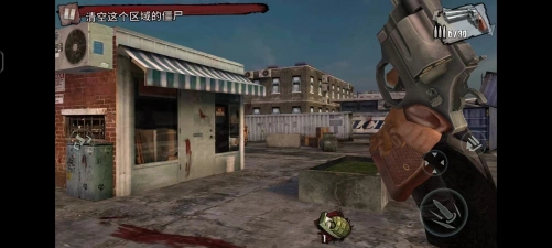 4、进入游戏后,左上角会显示本局的任务——清空该区域的僵尸。左侧用于控制方向,右侧的按钮分别对应射击、瞄准和装填子弹。当僵尸出现时,用手指在左侧滑动进行瞄准,随后射击。过程中请注意场景里的油桶,击爆它们或许能帮你瞬间消灭附近的僵尸。