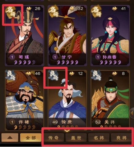 里,英雄品级分为四品,由低到高分别为:良将、名将、盖世、传奇。英雄品级非常直观的显示在英雄的左上角(如图所示)