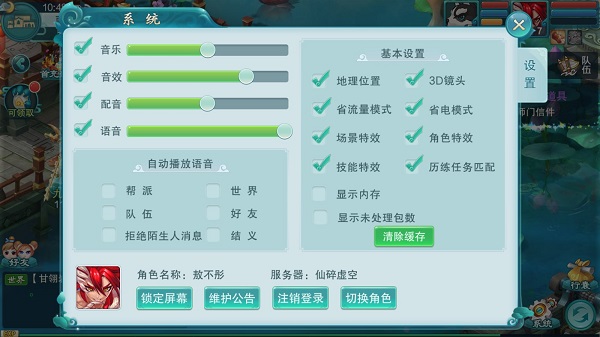4、玩家可在右下角的“系统”菜单里调整各项基础设置,涵盖地理位置、省流量模式、场景特效、技能特效、3D镜头、角色特效和历练任务匹配等内容。除此之外,语音相关的设置也能在此处完成,比如帮派、世界、队伍、好友等不同频道的语音调节。