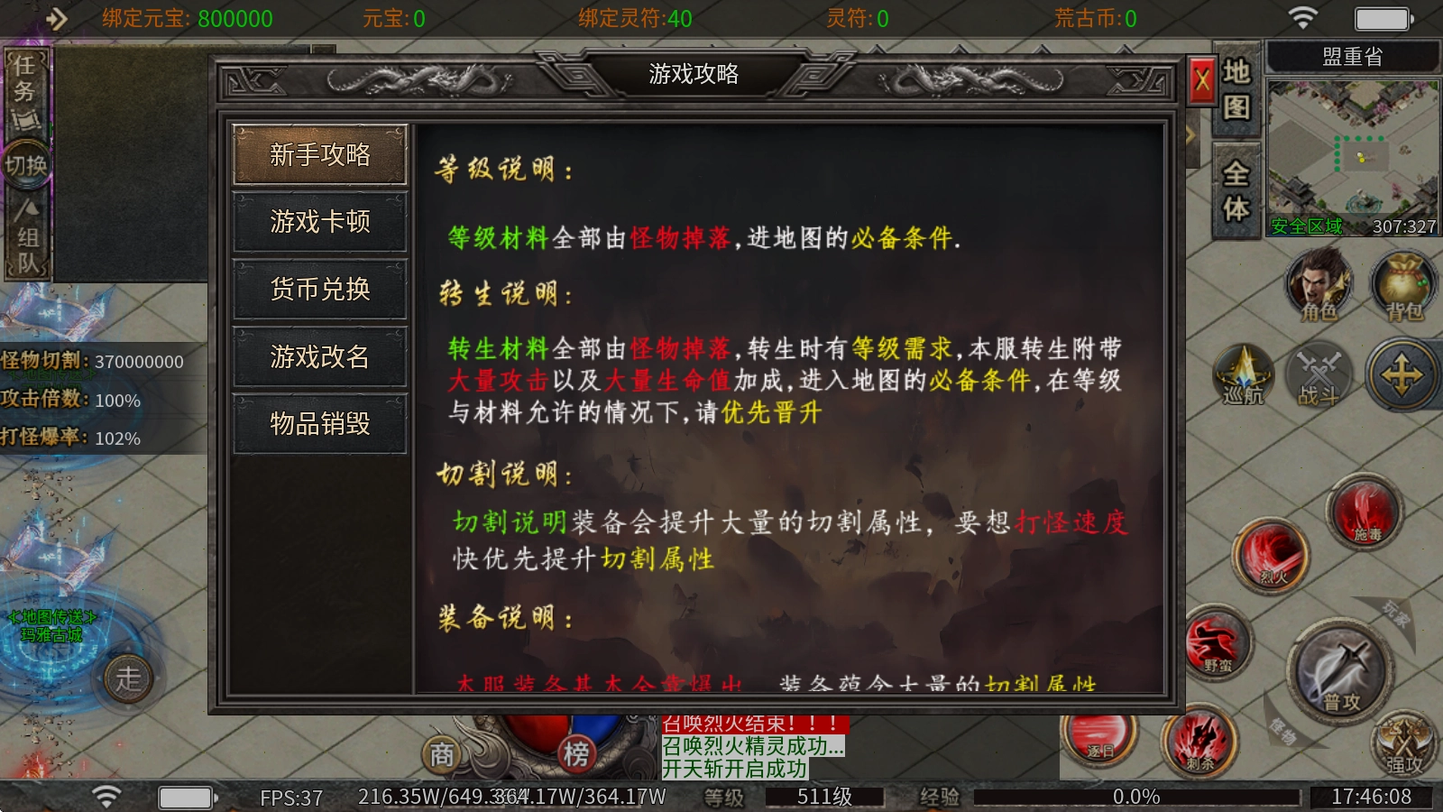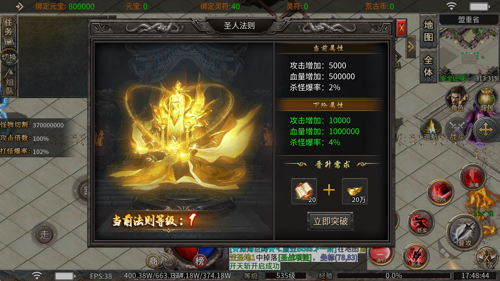 4、圣人法则:消耗剑法则之书与元宝就能提升,不仅能得到攻击和血量的加成,还可以提高杀怪的爆率。