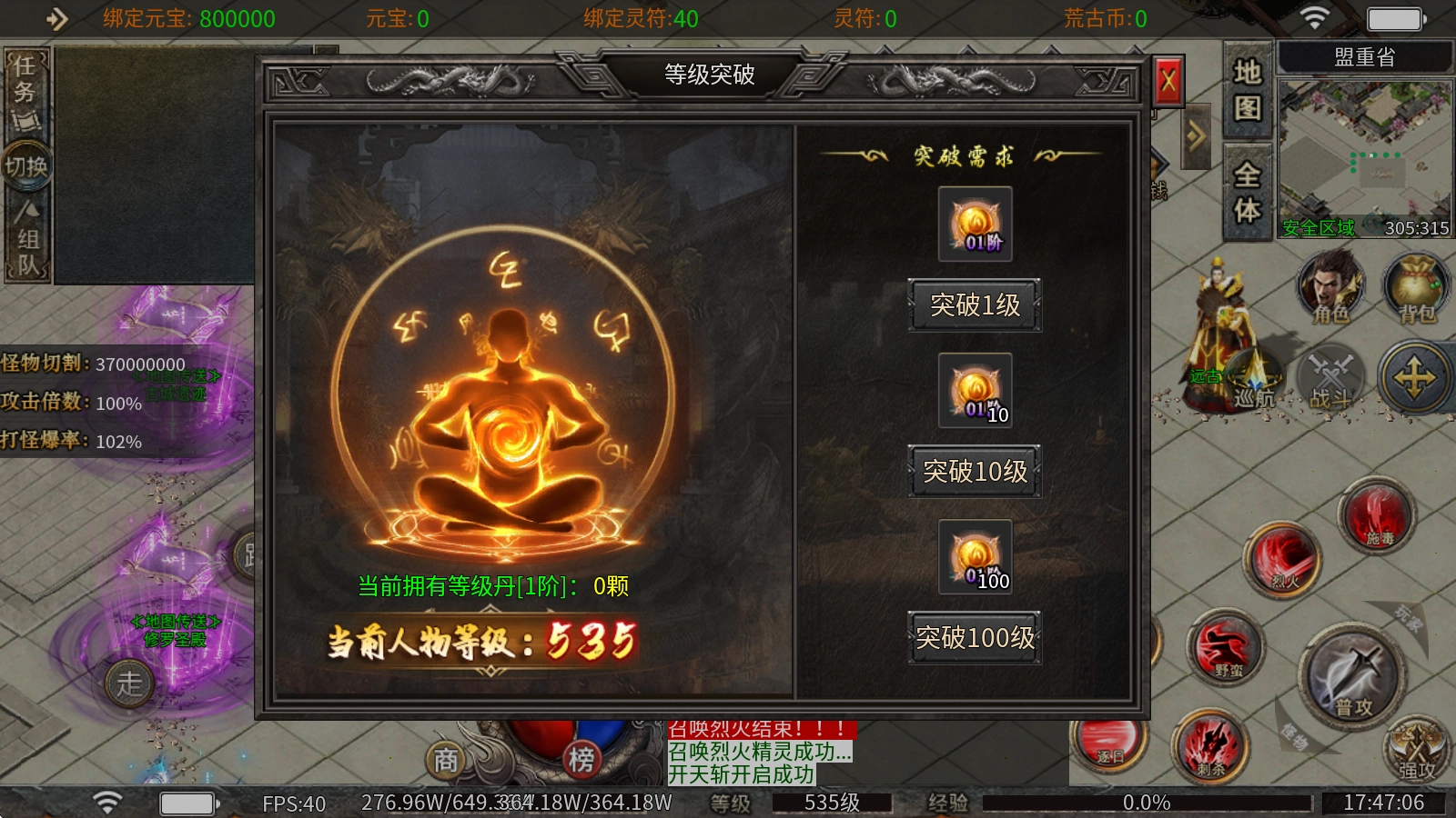 1、等级突破:当等级达到500级后,后续升级需使用等级丹,该道具可通过击杀怪物获取。