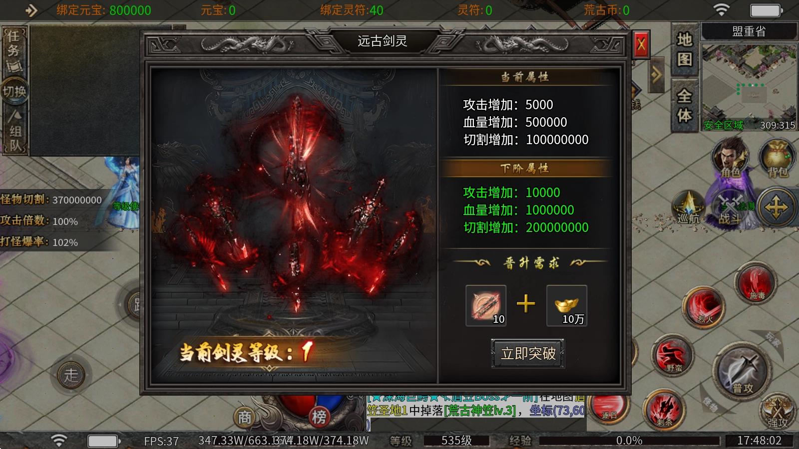 3、远古剑灵:消耗剑灵残骸与元宝就能提升剑灵等级,每提升一级不仅会增加攻击和血量,还能获取大量切割伤害。
