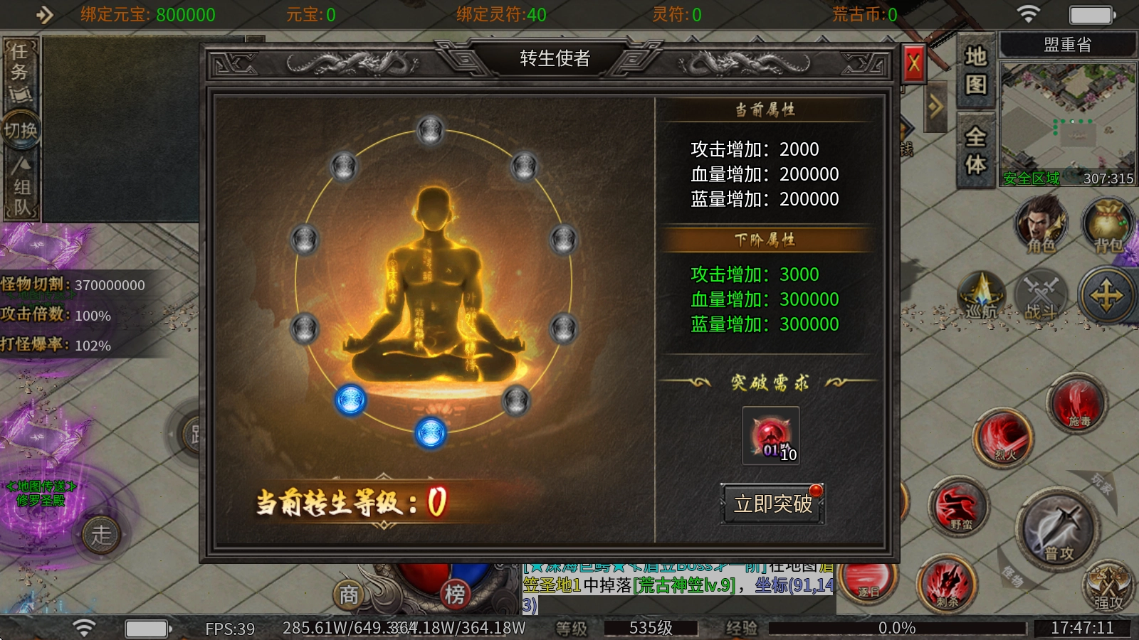2、转生使者:消耗转生晶核就能提升等级,每升一级都会增加大量攻击、血量和蓝量属性,所需材料可通过打怪获取。