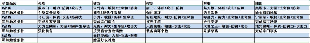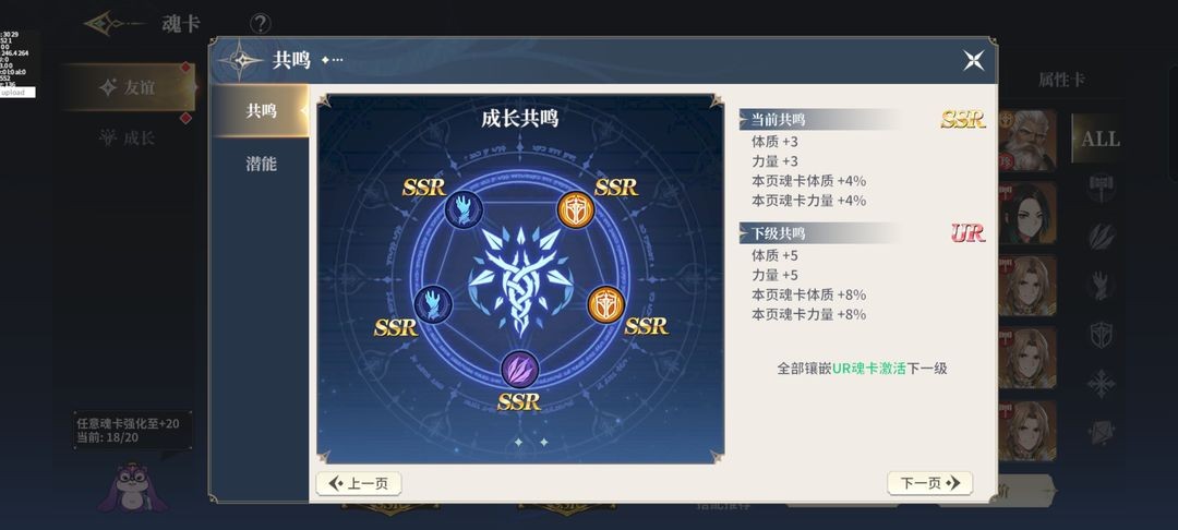 玩家在前期阶段可以自由强化魂卡,强化操作后支持回退功能,回退时会全额返还所有强化材料;哪怕当前强化的魂卡并非所需,后续获取到目标魂卡后,也能先将已强化的魂卡回退,再用返还的材料去强化需要的魂卡。下图将展示魂卡达到SSR品质后的具体属性,以及魂卡羁绊的触发条件,魂卡的属性构成顺序为四维属性、基础属性与羁绊属性。