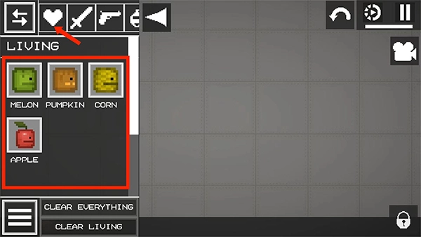 2、进入菜单界面,找到并点击【爱心】图标,在弹出的人物列表中选择任意一个角色,接着将其拖动到地面上,此处我们以西瓜人作为示例。